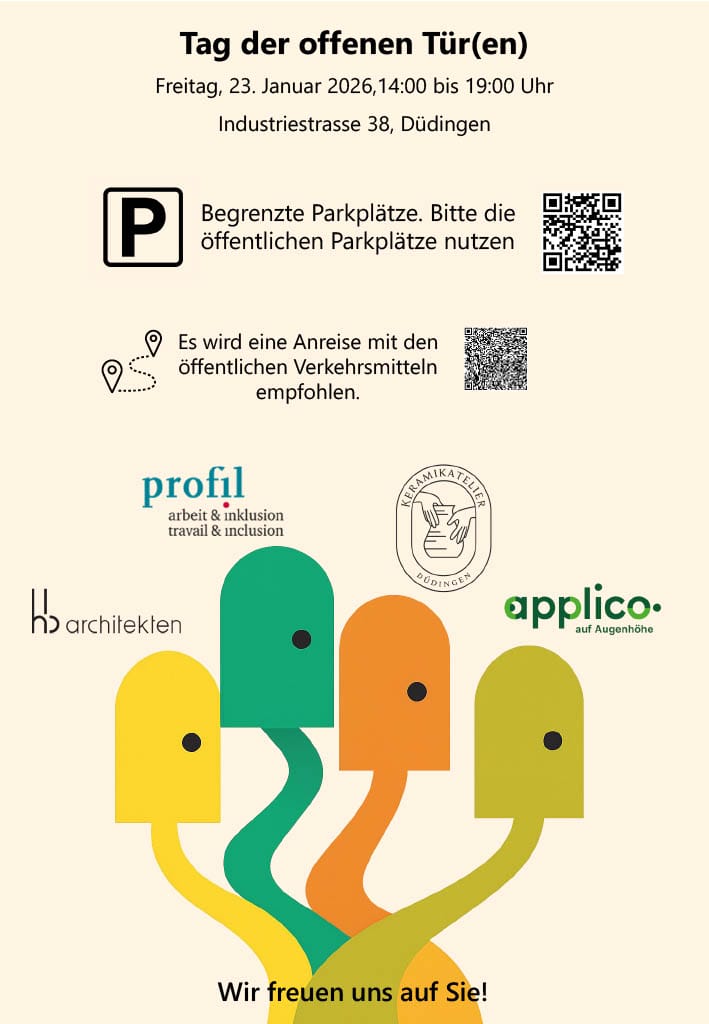 Zusammen mit der Stiftung applico, der Stiftung Profil und dem Keramikatelier Düdingen öffnen auch wir unsere Türen: